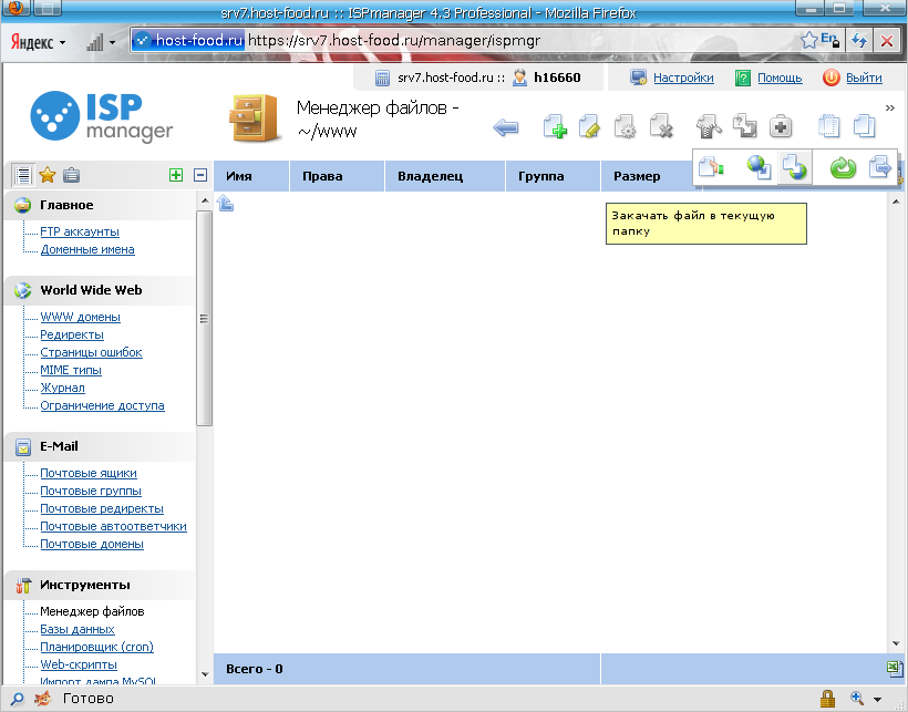 Установка галереи 4images. переходим в панель управления хостингом (кнопка с шестерёнкой напротив заказа хостинга в биллинге), там в "Менеджер файлов", в нём переходим в директорию "www". Удаляем директорию www (разумеется, если там нет нужных файлов) для домена куда ставим галерею: