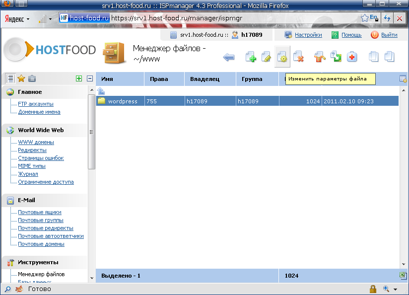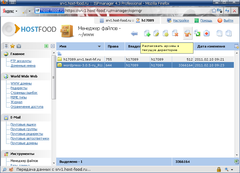 Для инсталляции WordPress, переходим в панель управления хостингом (кнопка с шестерёнкой напротив заказа хостинга в биллинге), там в "Менеджер файлов", в нём переходим в директорию "www". Нажимаем кнопку "Закачать файл в текущую директорию":